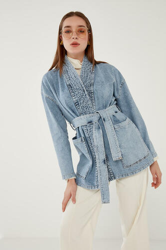 %100 pamuk denimden üretilen bu kot ceket düz kesimli, yakasız, büyük ceplerle tamamlanmıştır. Çabasız ve kolay kombinlenebilen bu ceketi onun silueti zarafet katar.